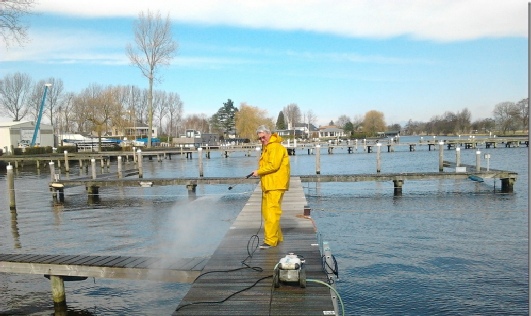 En zelfs als het nog geen voorjaar wil worden en het zelfs nog ijskoud is, worden de steigers schoon gespoten. Dolf weet dit allemaal haarfijn vast te leggen met zijn digitale camera.